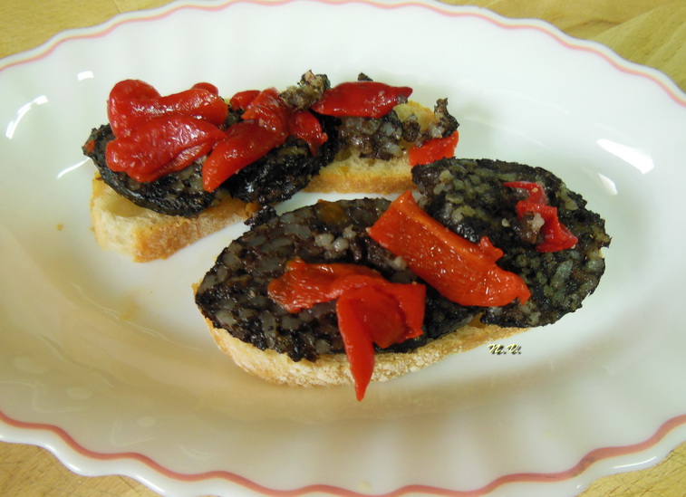 INGREDIENTES.- (Para 2 personas).- La cantidad de morcilla, que hoy he puesto, es de unos 175gr. Era para probar ésta morcilla. Se hace con la que más os guste, naturalmente. Pan bizcochado, o tierno, pimientos del piquillo en tiras, 1-2 dientes de ajo o si queréis ajo en polvo, un poco de aceite oliva virgen extra y una pizca de sal en los pimientos.